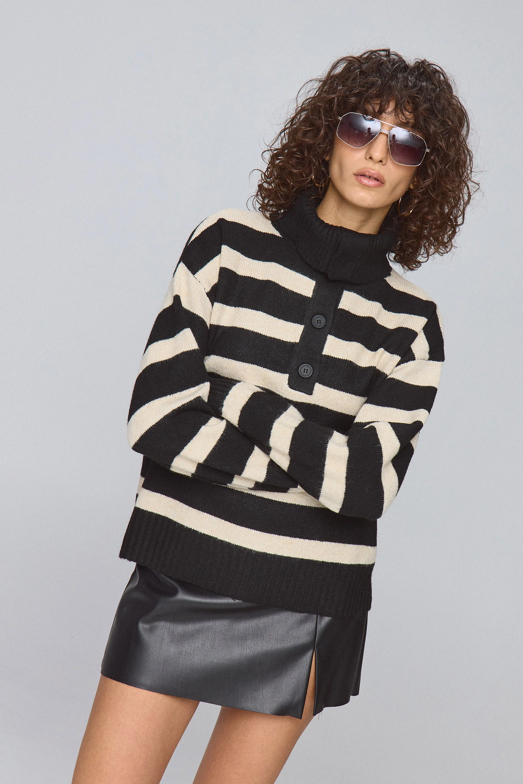 חולצת סריג פסים ארוכה עם צווארון גולף מתקפל בשילוב כפתורים.