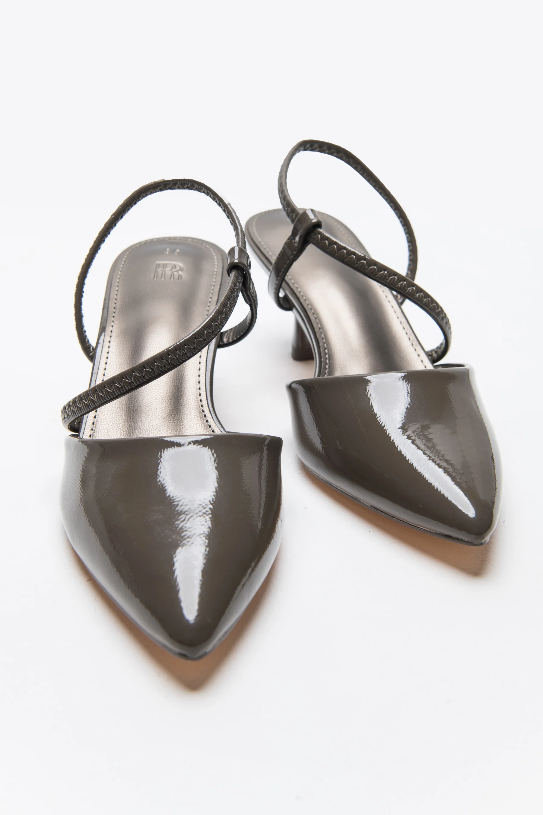 נעלי עקב עם סיומת סגורה שפיצית. לנעליים רצועה בשילוב גומי סביב הקרסול ועקב דק.