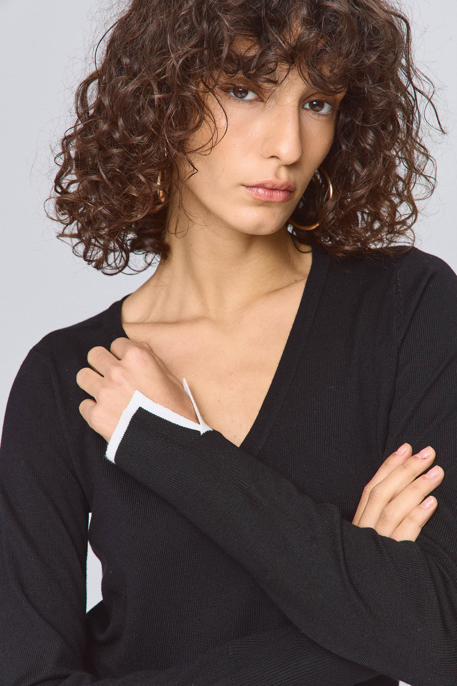 חולצת סריג ארוכה עם מחשוף וי ושליץ בסיומת השרוול.