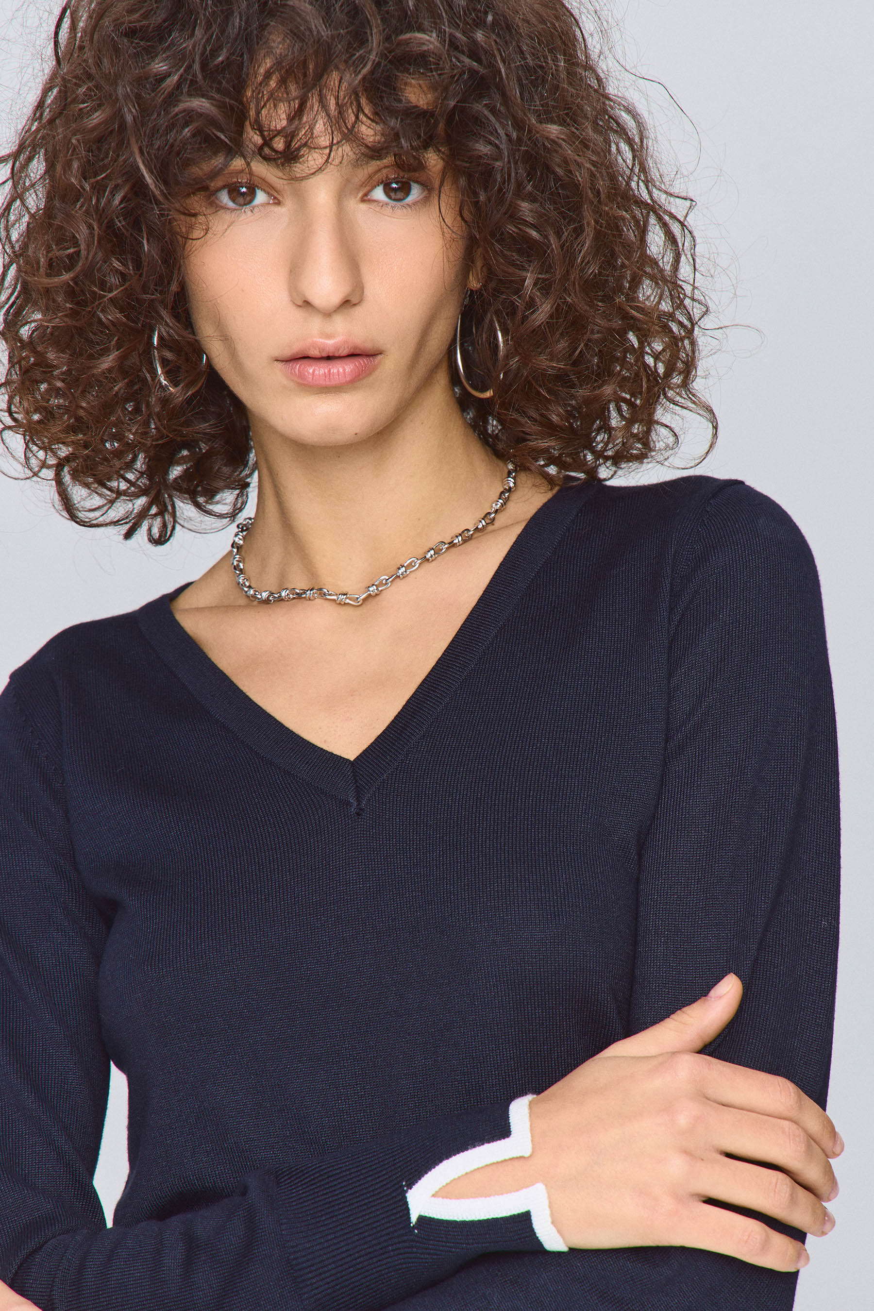 חולצת סריג ארוכה עם מחשוף וי ושליץ בסיומת השרוול.